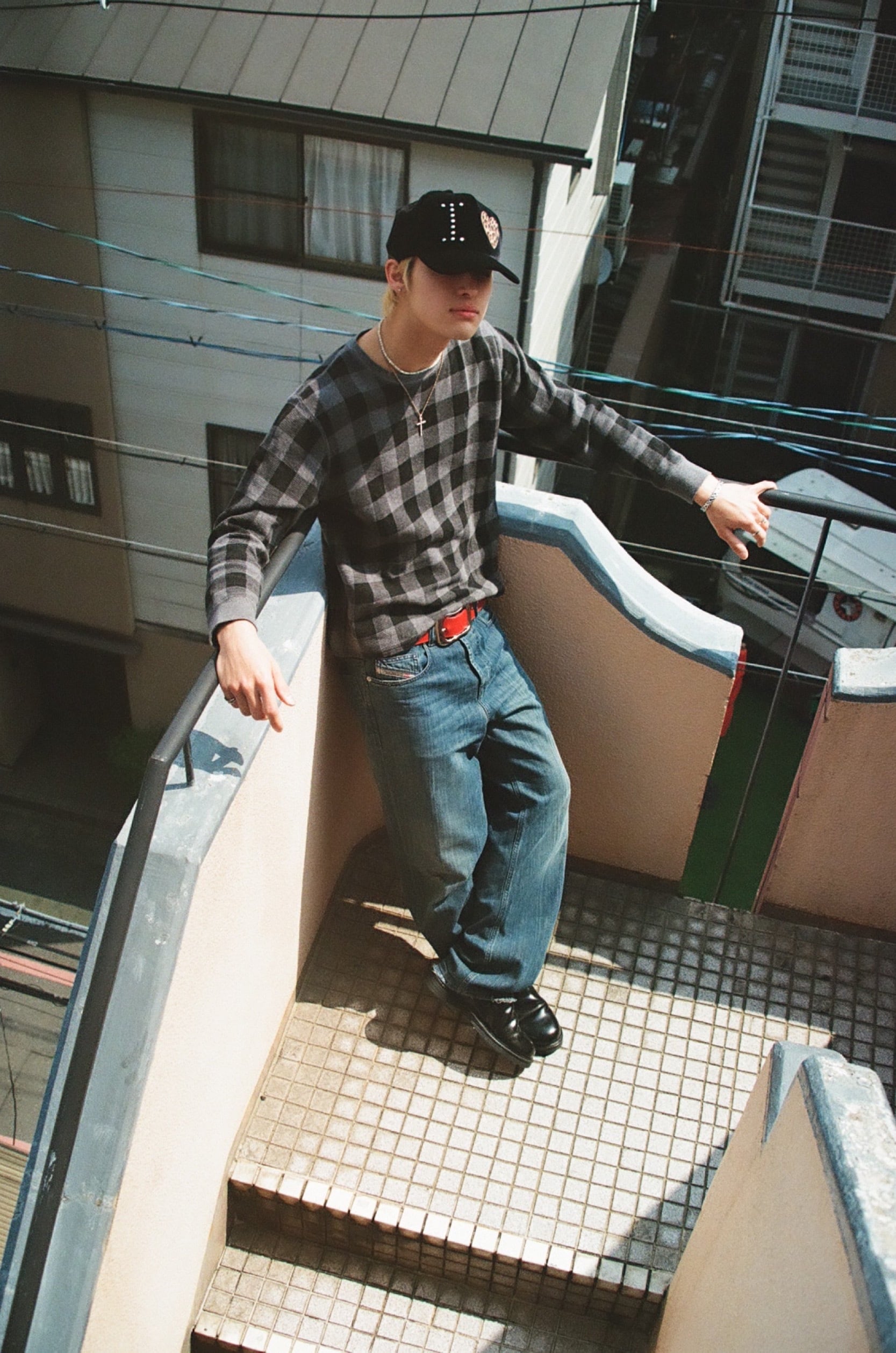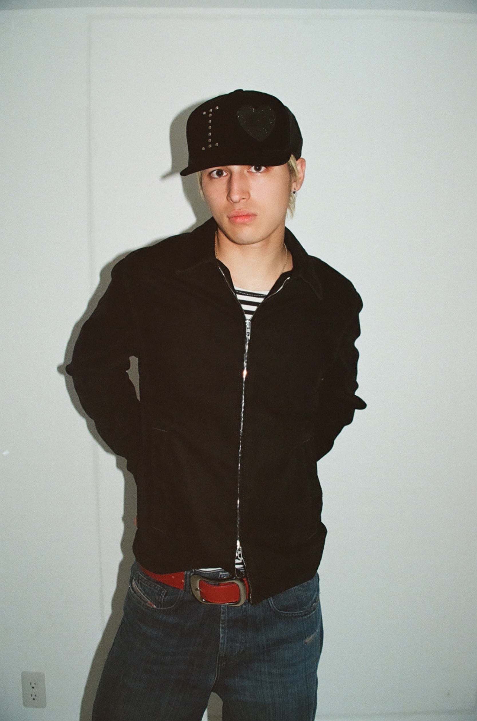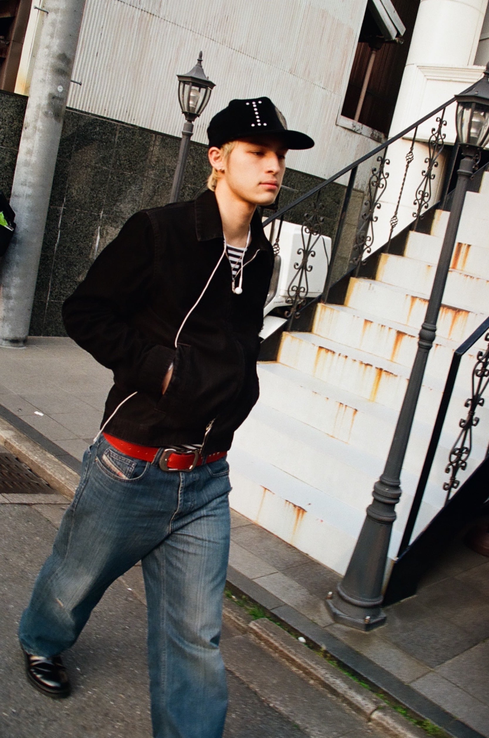 デニムとお気に入りのTシャツに赤ベルト。